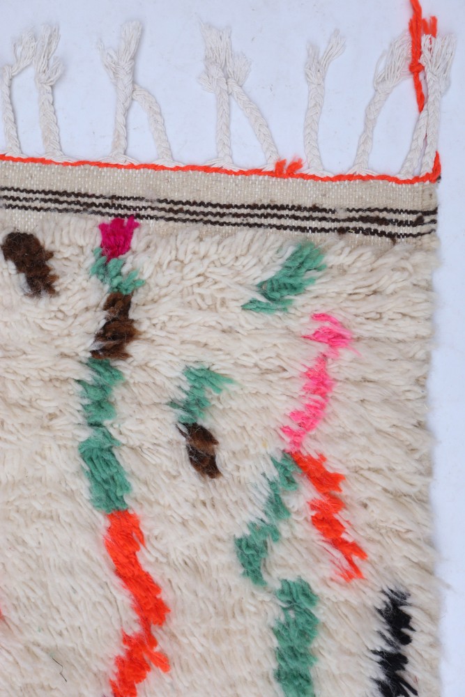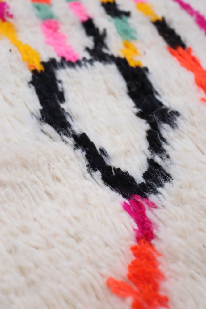 Ce tapis berbère que l'on appelle Azilal tient son nom de la région d'Azilal au Maroc où il a été confectionné à la main sur un métier à tisser traditionnel en bois. Ses motifs représentent les humeurs, les amours, les peines de la tisseuse au moment de sa création. Une fois ce tapis berbère coloré créé, elle en confectionnera un autre totalement différent, en fonction de ses émotions du moment. Chaque pièce est donc unique.