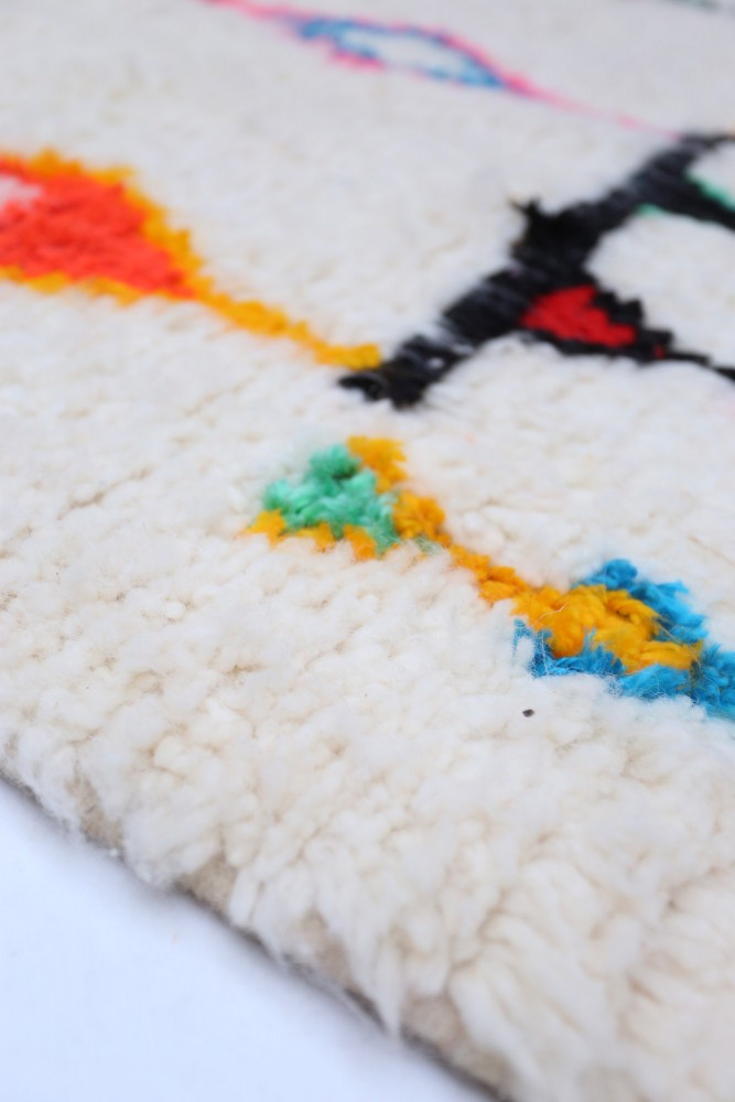 Ce tapis berbère que l'on appelle Azilal tient son nom de la région d'Azilal au Maroc où il a été confectionné à la main sur un métier à tisser traditionnel en bois. Ses motifs représentent les humeurs, les amours, les peines de la tisseuse au moment de sa création. Une fois ce tapis berbère coloré créé, elle en confectionnera un autre totalement différent, en fonction de ses émotions du moment. Chaque pièce est donc unique.