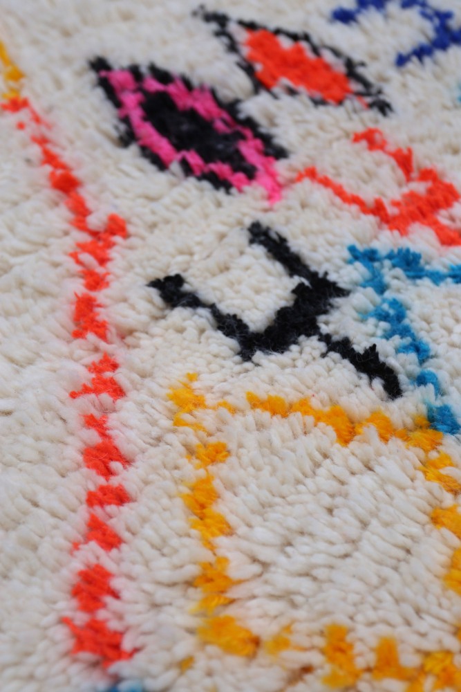 Ce tapis berbère que l'on appelle Azilal tient son nom de la région d'Azilal au Maroc où il a été confectionné à la main sur un métier à tisser traditionnel en bois. Ses motifs représentent les humeurs, les amours, les peines de la tisseuse au moment de sa création. Une fois ce tapis berbère coloré créé, elle en confectionnera un autre totalement différent, en fonction de ses émotions du moment. Chaque pièce est donc unique.