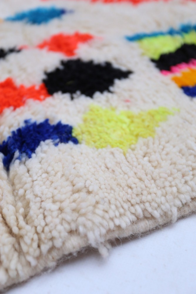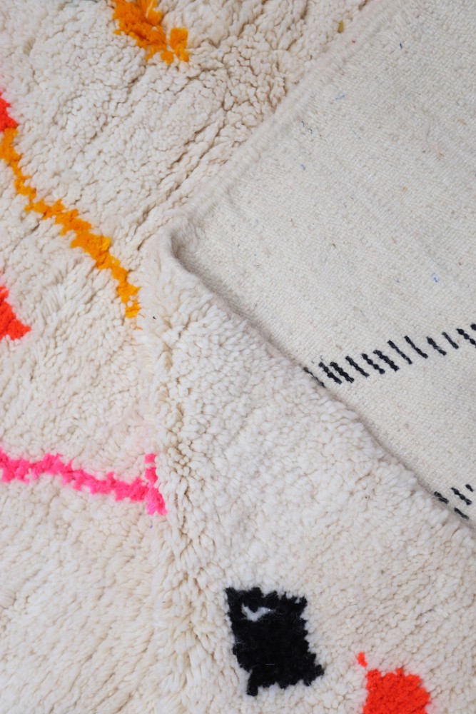 Ce tapis berbère que l'on appelle Azilal tient son nom de la région d'Azilal au Maroc où il a été confectionné à la main sur un métier à tisser traditionnel en bois. Ses motifs représentent les humeurs, les amours, les peines de la tisseuse au moment de sa création. Une fois ce tapis berbère coloré créé, elle en confectionnera un autre totalement différent, en fonction de ses émotions du moment. Chaque pièce est donc unique.