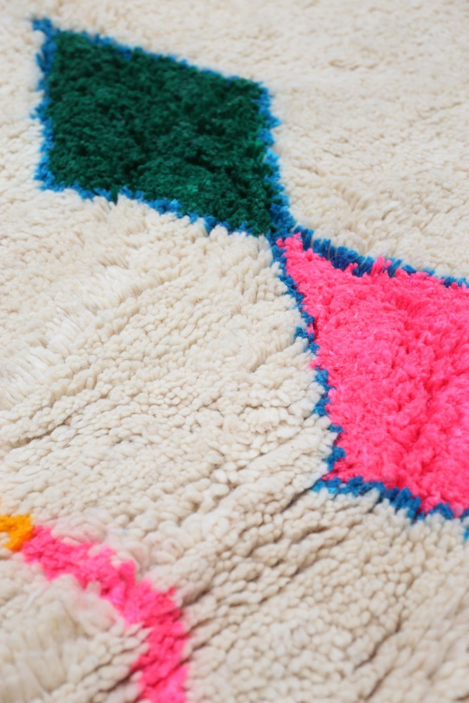 Ce tapis berbère que l'on appelle Azilal tient son nom de la région d'Azilal au Maroc où il a été confectionné à la main sur un métier à tisser traditionnel en bois. Ses motifs représentent les humeurs, les amours, les peines de la tisseuse au moment de sa création. Une fois ce tapis berbère coloré créé, elle en confectionnera un autre totalement différent, en fonction de ses émotions du moment. Chaque pièce est donc unique.