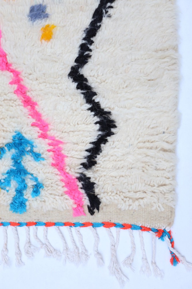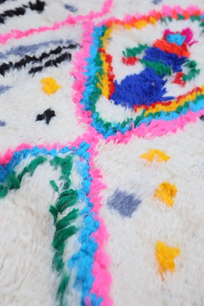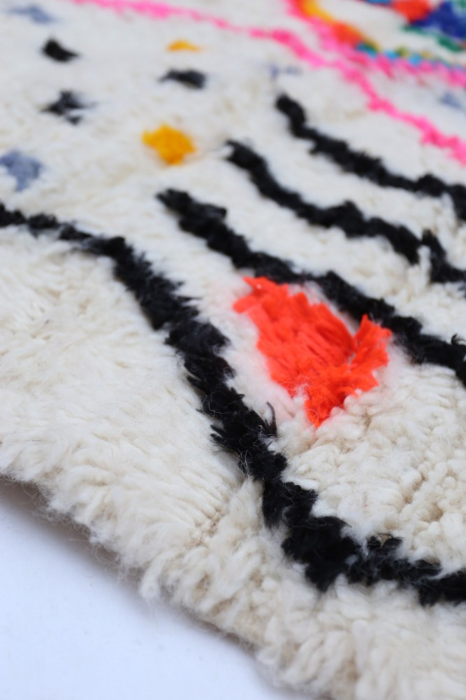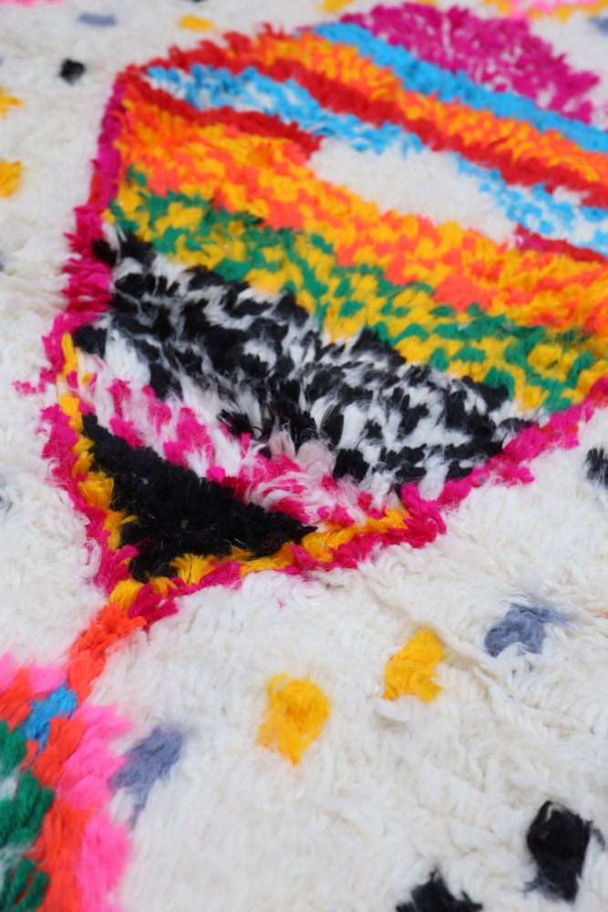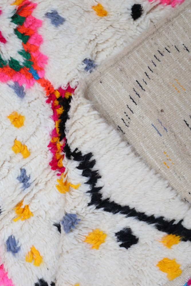 Ce tapis berbère que l'on appelle Azilal tient son nom de la région d'Azilal au Maroc où il a été confectionné à la main sur un métier à tisser traditionnel en bois. Ses motifs représentent les humeurs, les amours, les peines de la tisseuse au moment de sa création. Une fois ce tapis berbère coloré créé, elle en confectionnera un autre totalement différent, en fonction de ses émotions du moment. Chaque pièce est donc unique.