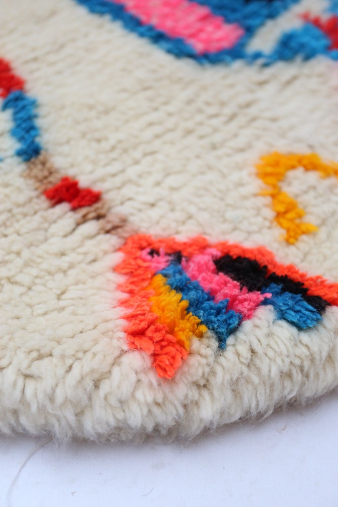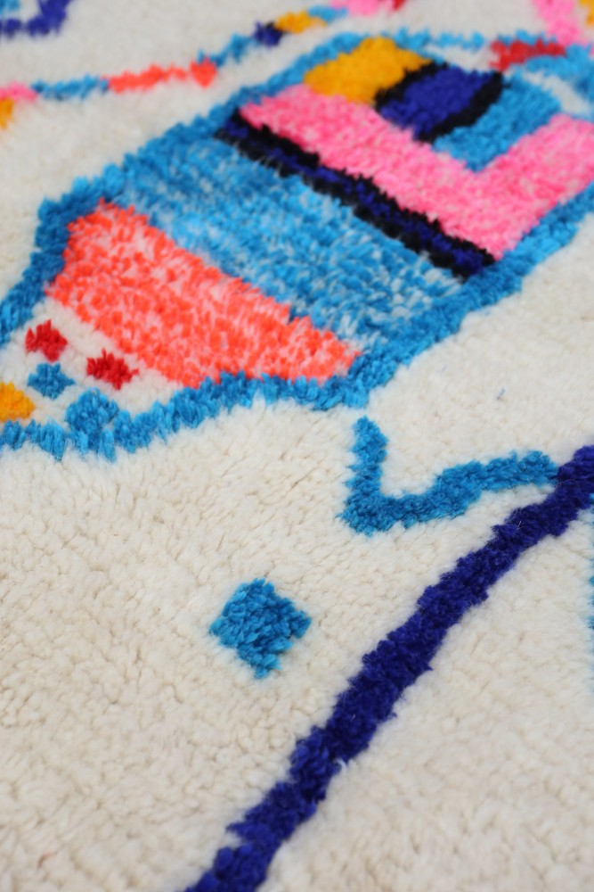 Ce tapis berbère que l'on appelle Azilal tient son nom de la région d'Azilal au Maroc où il a été confectionné à la main sur un métier à tisser traditionnel en bois. Ses motifs représentent les humeurs, les amours, les peines de la tisseuse au moment de sa création. Une fois ce tapis berbère coloré créé, elle en confectionnera un autre totalement différent, en fonction de ses émotions du moment. Chaque pièce est donc unique.