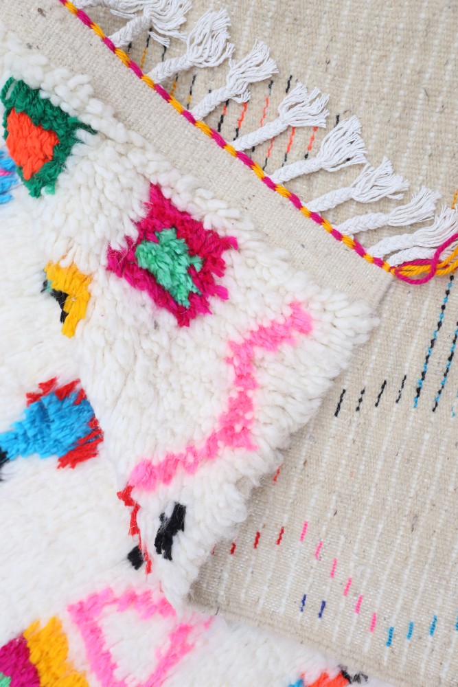 Ce tapis berbère que l'on appelle Azilal tient son nom de la région d'Azilal au Maroc où il a été confectionné à la main sur un métier à tisser traditionnel en bois. Ses motifs représentent les humeurs, les amours, les peines de la tisseuse au moment de sa création. Une fois ce tapis berbère coloré créé, elle en confectionnera un autre totalement différent, en fonction de ses émotions du moment. Chaque pièce est donc unique.