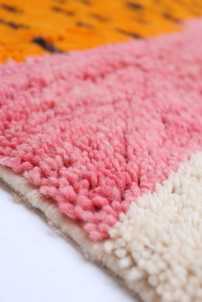 Ce tapis berbère que l'on appelle Azilal tient son nom de la région d'Azilal au Maroc où il a été confectionné à la main sur un métier à tisser traditionnel en bois. Ses motifs représentent les humeurs, les amours, les peines de la tisseuse au moment de sa création. Une fois ce tapis berbère coloré créé, elle en confectionnera un autre totalement différent, en fonction de ses émotions du moment. Chaque pièce est donc unique.