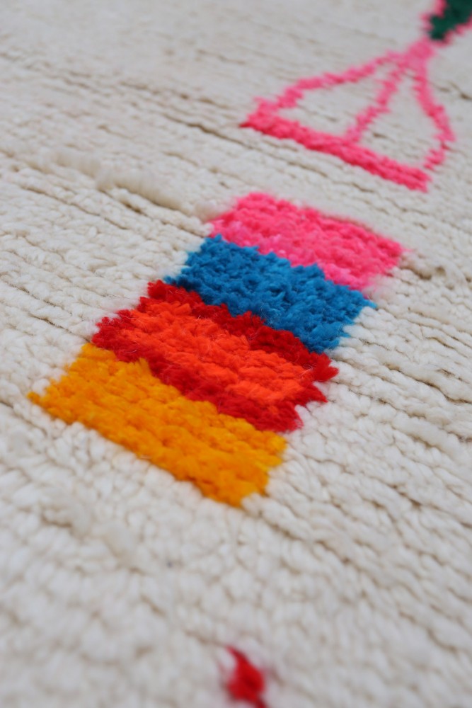 Ce tapis berbère que l'on appelle Azilal tient son nom de la région d'Azilal au Maroc où il a été confectionné à la main sur un métier à tisser traditionnel en bois. Ses motifs représentent les humeurs, les amours, les peines de la tisseuse au moment de sa création. Une fois ce tapis berbère coloré créé, elle en confectionnera un autre totalement différent, en fonction de ses émotions du moment. Chaque pièce est donc unique.