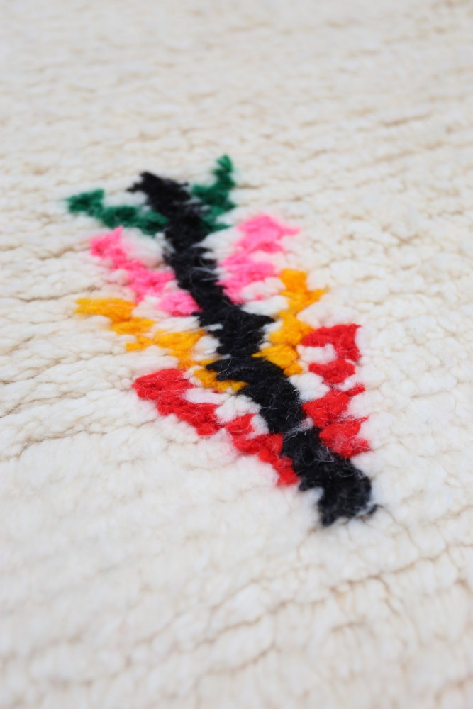 Nos tapis avec un fond blanc et des dessins colorés sont toujours avec un fond blanc en laine. Les couleurs peuvent être soit en coton soit en laine. Les couleurs très vives sont généralement en coton et les couleurs qui ont un rendu plus naturel sont elles en laine. Nos tapis qui sont tout colorés sont eux 100% en laine.