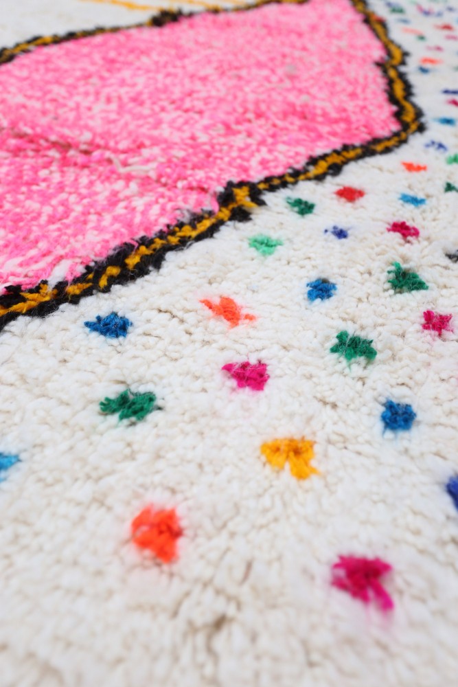 Ce tapis berbère que l'on appelle Azilal tient son nom de la région d'Azilal au Maroc où il a été confectionné à la main sur un métier à tisser traditionnel en bois. Ses motifs représentent les humeurs, les amours, les peines de la tisseuse au moment de sa création. Une fois ce tapis berbère coloré créé, elle en confectionnera un autre totalement différent, en fonction de ses émotions du moment. Chaque pièce est donc unique.