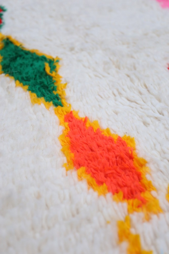 Ce tapis berbère que l'on appelle Azilal tient son nom de la région d'Azilal au Maroc où il a été confectionné à la main sur un métier à tisser traditionnel en bois. Ses motifs représentent les humeurs, les amours, les peines de la tisseuse au moment de sa création. Une fois ce tapis berbère coloré créé, elle en confectionnera un autre totalement différent, en fonction de ses émotions du moment. Chaque pièce est donc unique.