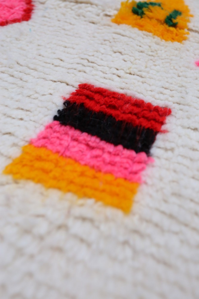 Nos tapis avec un fond blanc et des dessins colorés sont toujours avec un fond blanc en laine. Les couleurs peuvent être soit en coton soit en laine. Les couleurs très vives sont généralement en coton et les couleurs qui ont un rendu plus naturel sont elles en laine. Nos tapis qui sont tout colorés sont eux 100% en laine.