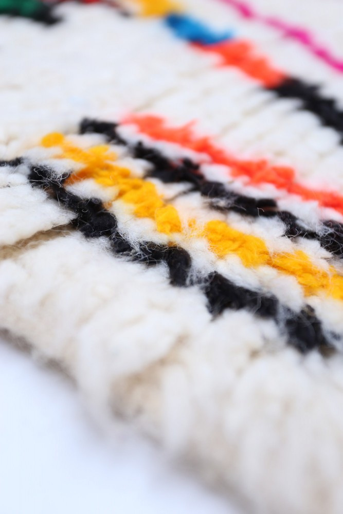 Ce tapis berbère que l'on appelle Azilal tient son nom de la région d'Azilal au Maroc où il a été confectionné à la main sur un métier à tisser traditionnel en bois. Ses motifs représentent les humeurs, les amours, les peines de la tisseuse au moment de sa création. Une fois ce tapis berbère coloré créé, elle en confectionnera un autre totalement différent, en fonction de ses émotions du moment. Chaque pièce est donc unique.