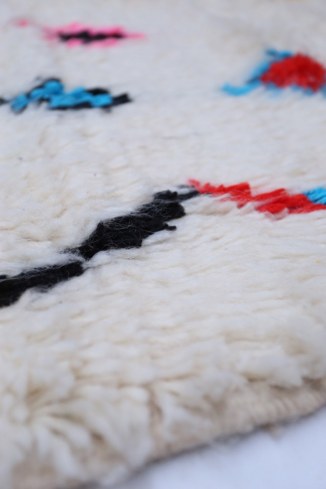 Ce tapis berbère que l'on appelle Azilal tient son nom de la région d'Azilal au Maroc où il a été confectionné à la main sur un métier à tisser traditionnel en bois. Ses motifs représentent les humeurs, les amours, les peines de la tisseuse au moment de sa création. Une fois ce tapis berbère coloré créé, elle en confectionnera un autre totalement différent, en fonction de ses émotions du moment. Chaque pièce est donc unique.