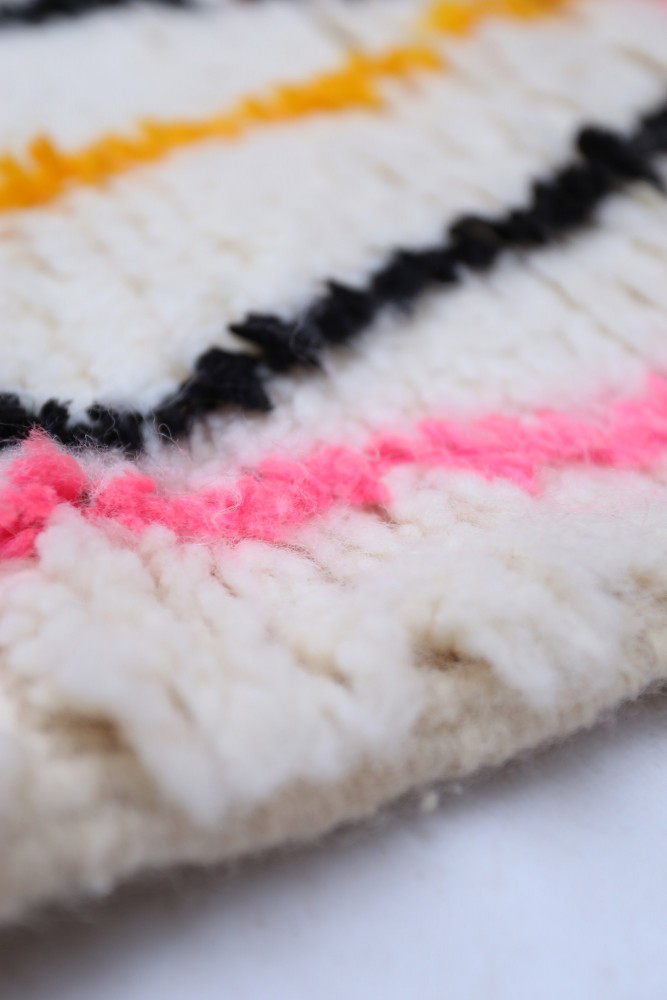 Ce tapis berbère que l'on appelle Azilal tient son nom de la région d'Azilal au Maroc où il a été confectionné à la main sur un métier à tisser traditionnel en bois. Ses motifs représentent les humeurs, les amours, les peines de la tisseuse au moment de sa création. Une fois ce tapis berbère coloré créé, elle en confectionnera un autre totalement différent, en fonction de ses émotions du moment. Chaque pièce est donc unique.