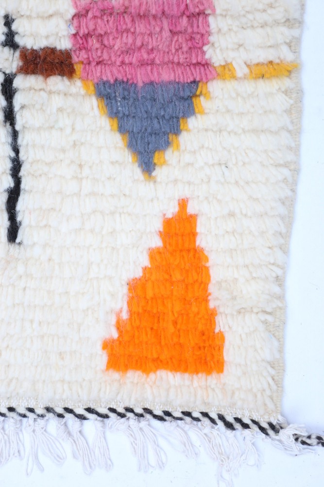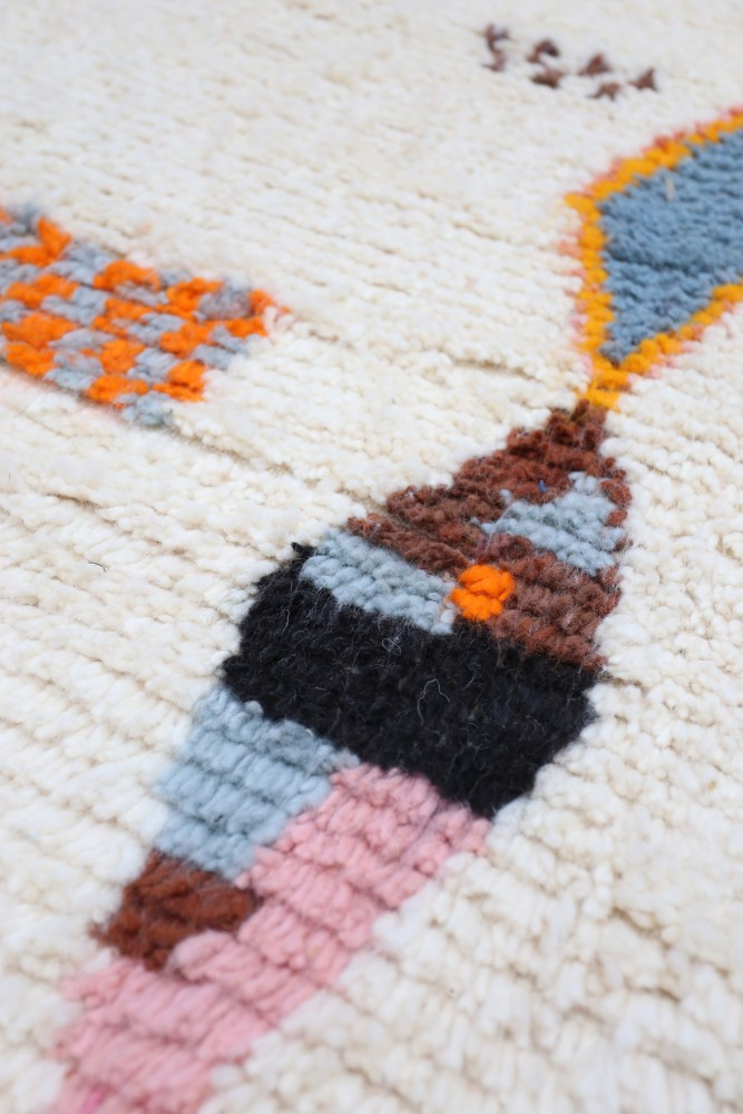 Ce tapis berbère que l'on appelle Azilal tient son nom de la région d'Azilal au Maroc où il a été confectionné à la main sur un métier à tisser traditionnel en bois. Ses motifs représentent les humeurs, les amours, les peines de la tisseuse au moment de sa création. Une fois ce tapis berbère coloré créé, elle en confectionnera un autre totalement différent, en fonction de ses émotions du moment. Chaque pièce est donc unique.