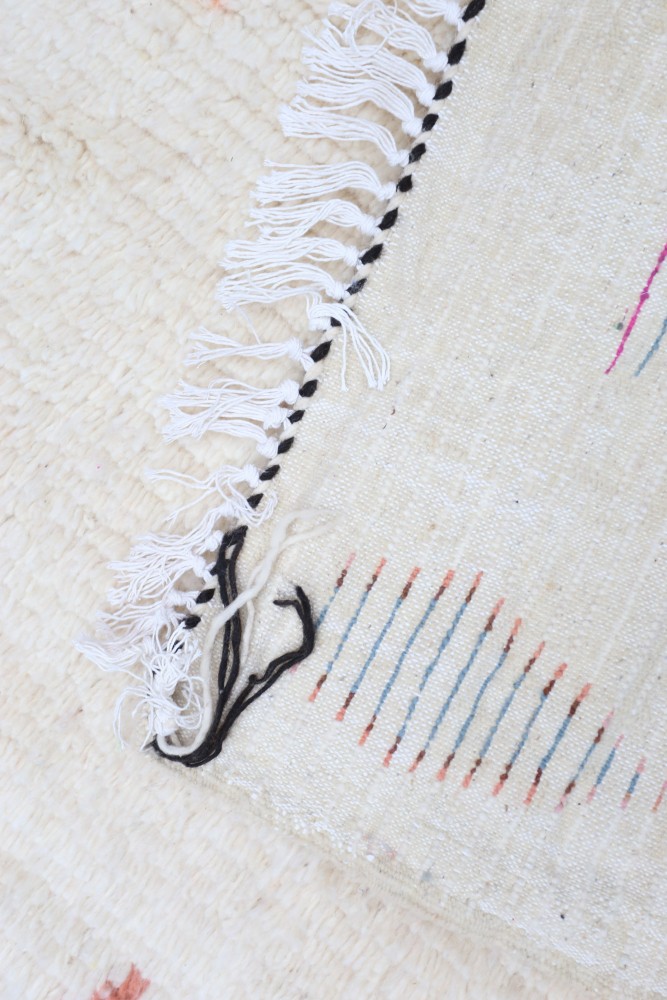 Nos tapis avec un fond blanc et des dessins colorés sont toujours avec un fond blanc en laine. Les couleurs peuvent être soit en coton soit en laine. Les couleurs très vives sont généralement en coton et les couleurs qui ont un rendu plus naturel sont elles en laine. Nos tapis qui sont tout colorés sont eux 100% en laine.
