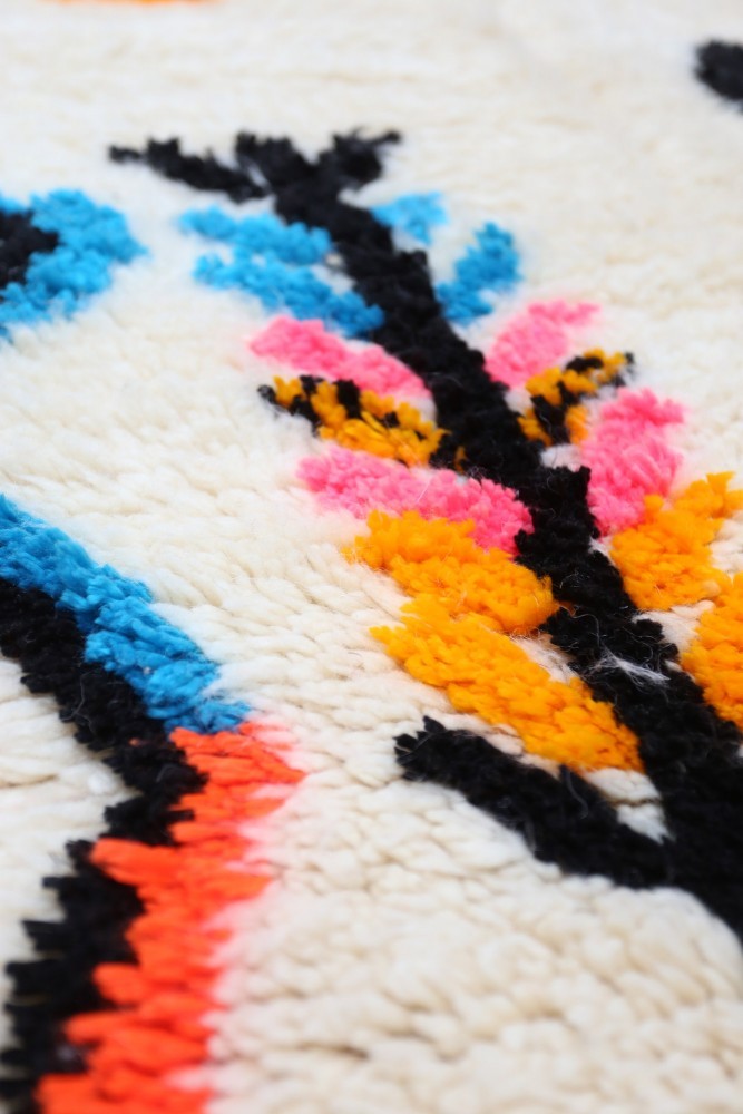 Ce tapis berbère que l'on appelle Azilal tient son nom de la région d'Azilal au Maroc où il a été confectionné à la main sur un métier à tisser traditionnel en bois. Ses motifs représentent les humeurs, les amours, les peines de la tisseuse au moment de sa création. Une fois ce tapis berbère coloré créé, elle en confectionnera un autre totalement différent, en fonction de ses émotions du moment. Chaque pièce est donc unique.