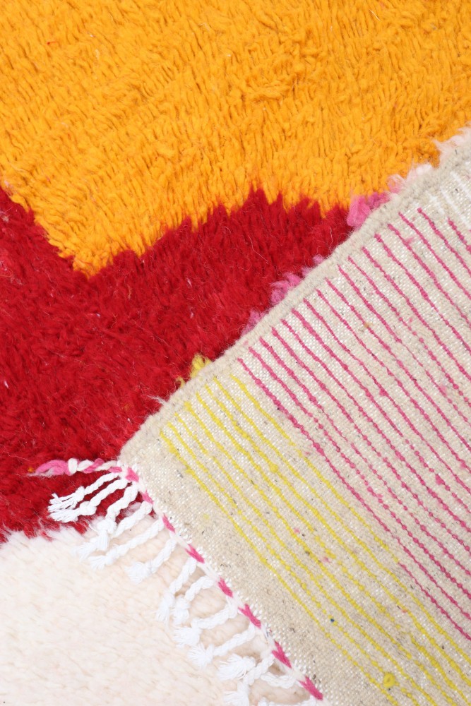 Ce tapis berbère que l'on appelle Azilal tient son nom de la région d'Azilal au Maroc où il a été confectionné à la main sur un métier à tisser traditionnel en bois. Ses motifs représentent les humeurs, les amours, les peines de la tisseuse au moment de sa création. Une fois ce tapis berbère coloré créé, elle en confectionnera un autre totalement différent, en fonction de ses émotions du moment. Chaque pièce est donc unique.
