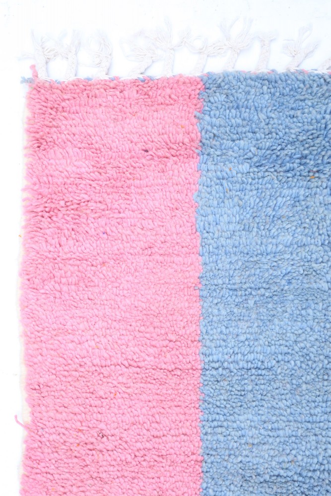 Ce tapis berbère que l'on appelle Azilal tient son nom de la région d'Azilal au Maroc où il a été confectionné à la main sur un métier à tisser traditionnel en bois. Ses motifs représentent les humeurs, les amours, les peines de la tisseuse au moment de sa création. Une fois ce tapis berbère coloré créé, elle en confectionnera un autre totalement différent, en fonction de ses émotions du moment. Chaque pièce est donc unique.