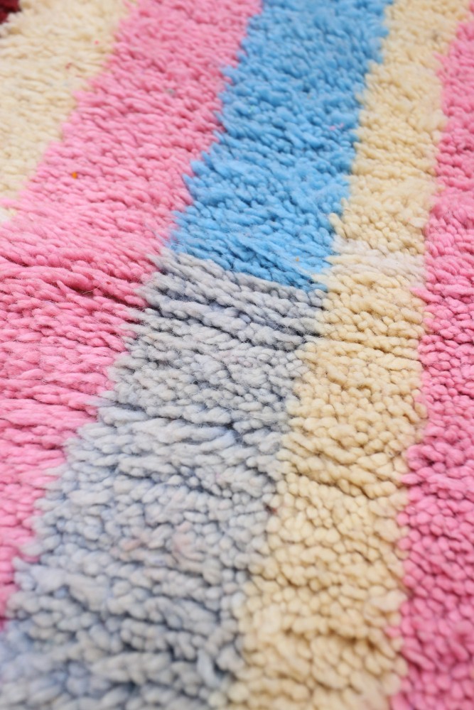 Ce tapis berbère que l'on appelle Azilal tient son nom de la région d'Azilal au Maroc où il a été confectionné à la main sur un métier à tisser traditionnel en bois. Ses motifs représentent les humeurs, les amours, les peines de la tisseuse au moment de sa création. Une fois ce tapis berbère coloré créé, elle en confectionnera un autre totalement différent, en fonction de ses émotions du moment. Chaque pièce est donc unique.