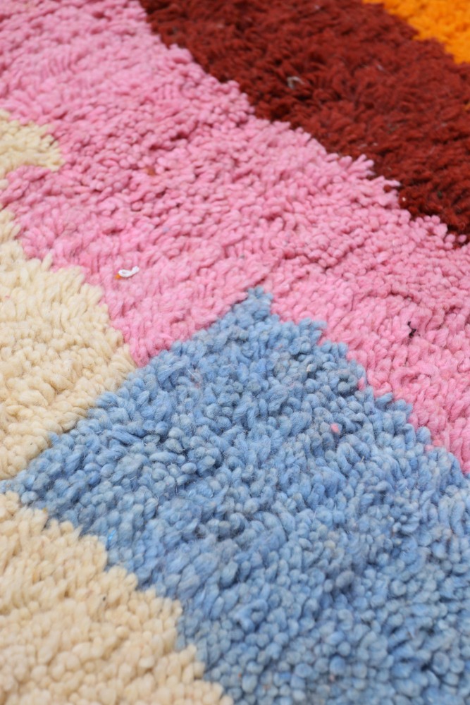 Ce tapis berbère que l'on appelle Azilal tient son nom de la région d'Azilal au Maroc où il a été confectionné à la main sur un métier à tisser traditionnel en bois. Ses motifs représentent les humeurs, les amours, les peines de la tisseuse au moment de sa création. Une fois ce tapis berbère coloré créé, elle en confectionnera un autre totalement différent, en fonction de ses émotions du moment. Chaque pièce est donc unique.