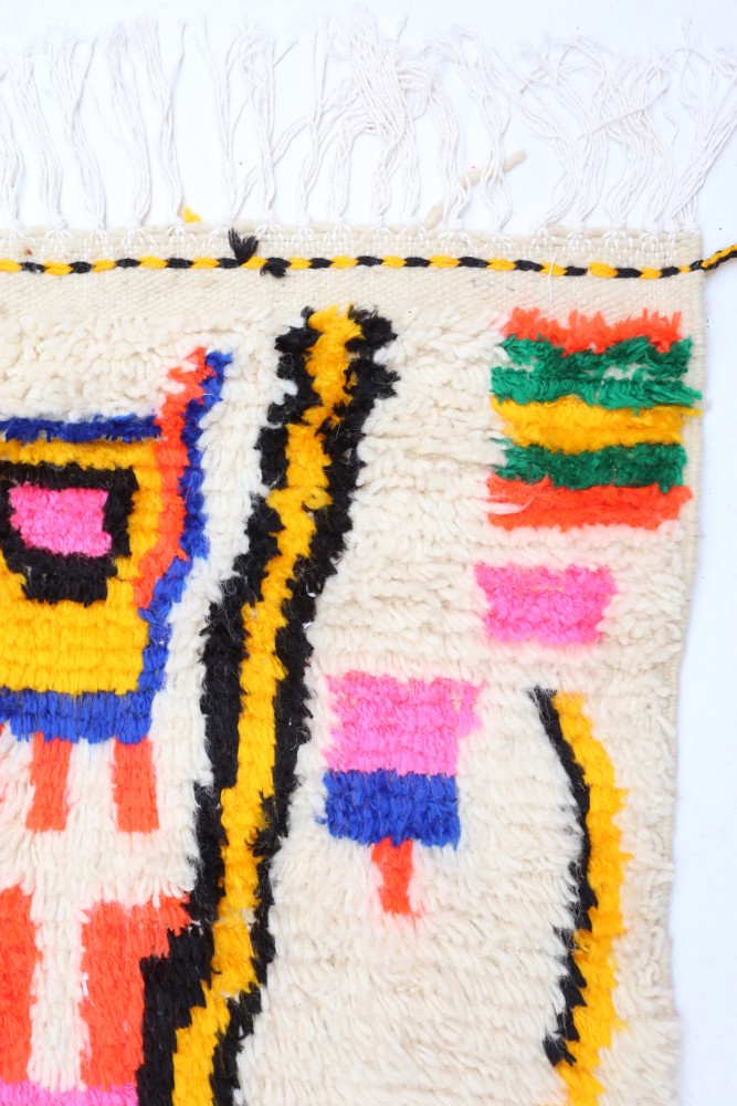 Ce tapis berbère que l'on appelle Azilal tient son nom de la région d'Azilal au Maroc où il a été confectionné à la main sur un métier à tisser traditionnel en bois. Ses motifs représentent les humeurs, les amours, les peines de la tisseuse au moment de sa création. Une fois ce tapis berbère coloré créé, elle en confectionnera un autre totalement différent, en fonction de ses émotions du moment. Chaque pièce est donc unique.