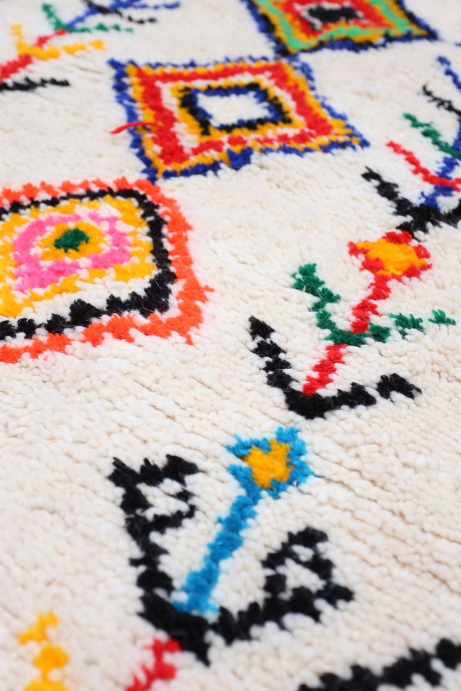 Ce tapis berbère que l'on appelle Azilal tient son nom de la région d'Azilal au Maroc où il a été confectionné à la main sur un métier à tisser traditionnel en bois. Ses motifs représentent les humeurs, les amours, les peines de la tisseuse au moment de sa création. Une fois ce tapis berbère coloré créé, elle en confectionnera un autre totalement différent, en fonction de ses émotions du moment. Chaque pièce est donc unique.