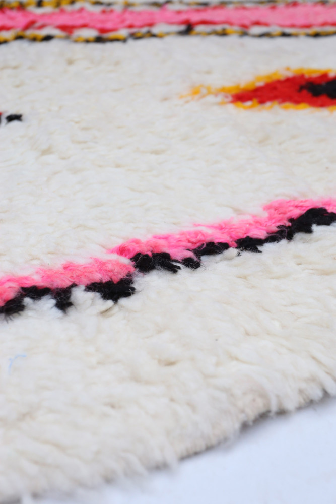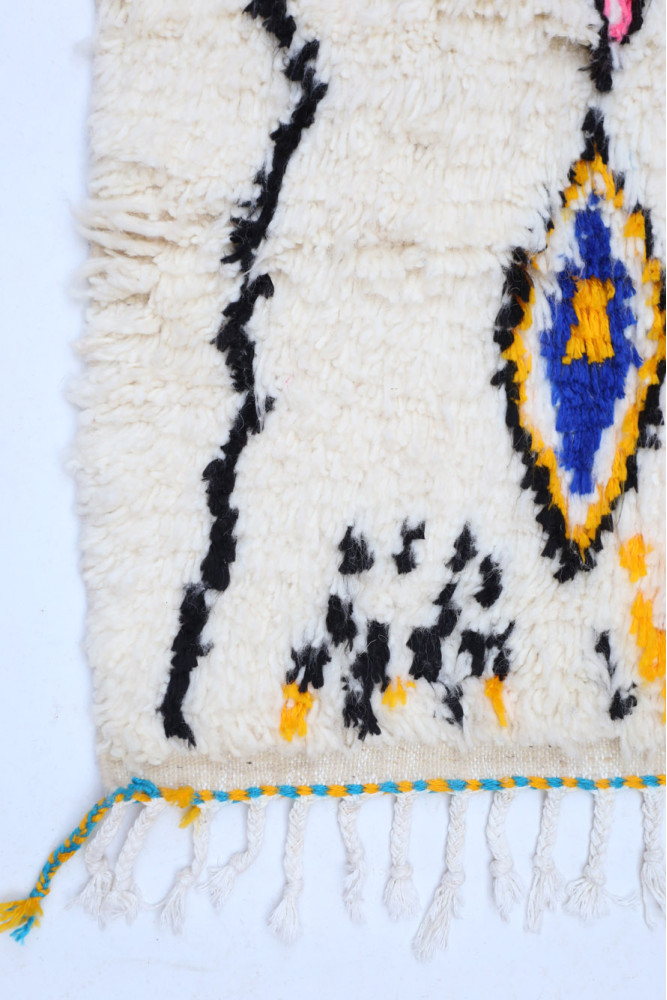 Ce tapis berbère que l'on appelle Azilal tient son nom de la région d'Azilal au Maroc où il a été confectionné à la main sur un métier à tisser traditionnel en bois. Ses motifs représentent les humeurs, les amours, les peines de la tisseuse au moment de sa création. Une fois ce tapis berbère coloré créé, elle en confectionnera un autre totalement différent, en fonction de ses émotions du moment. Chaque pièce est donc unique.