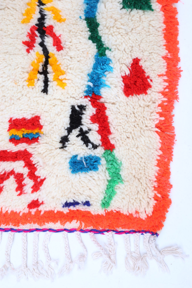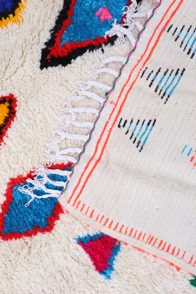 Ce tapis berbère que l'on appelle Azilal tient son nom de la région d'Azilal au Maroc où il a été confectionné à la main sur un métier à tisser traditionnel en bois. Ses motifs représentent les humeurs, les amours, les peines de la tisseuse au moment de sa création. Une fois ce tapis berbère coloré créé, elle en confectionnera un autre totalement différent, en fonction de ses émotions du moment. Chaque pièce est donc unique.