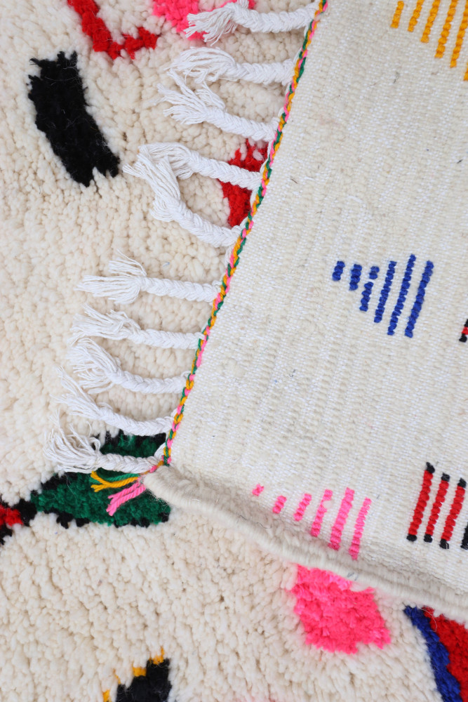 Ce tapis berbère que l'on appelle Azilal tient son nom de la région d'Azilal au Maroc où il a été confectionné à la main sur un métier à tisser traditionnel en bois. Ses motifs représentent les humeurs, les amours, les peines de la tisseuse au moment de sa création. Une fois ce tapis berbère coloré créé, elle en confectionnera un autre totalement différent, en fonction de ses émotions du moment. Chaque pièce est donc unique.