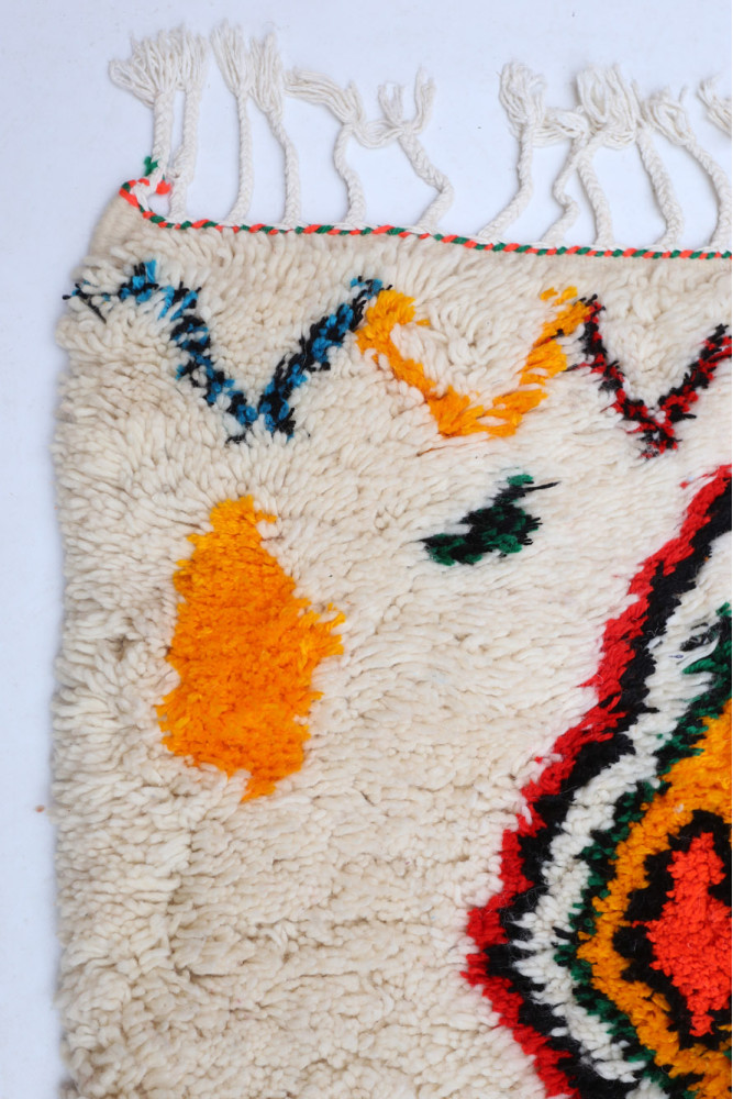 Ce tapis berbère que l'on appelle Azilal tient son nom de la région d'Azilal au Maroc où il a été confectionné à la main sur un métier à tisser traditionnel en bois. Ses motifs représentent les humeurs, les amours, les peines de la tisseuse au moment de sa création. Une fois ce tapis berbère coloré créé, elle en confectionnera un autre totalement différent, en fonction de ses émotions du moment. Chaque pièce est donc unique.