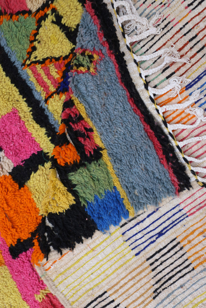 Ce tapis berbère que l'on appelle Azilal tient son nom de la région d'Azilal au Maroc où il a été confectionné à la main sur un métier à tisser traditionnel en bois. Ses motifs représentent les humeurs, les amours, les peines de la tisseuse au moment de sa création. Une fois ce tapis berbère coloré créé, elle en confectionnera un autre totalement différent, en fonction de ses émotions du moment. Chaque pièce est donc unique.