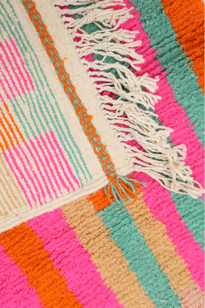 Ce tapis berbère que l'on appelle Azilal tient son nom de la région d'Azilal au Maroc où il a été confectionné à la main sur un métier à tisser traditionnel en bois. Ses motifs représentent les humeurs, les amours, les peines de la tisseuse au moment de sa création. Une fois ce tapis berbère coloré créé, elle en confectionnera un autre totalement différent, en fonction de ses émotions du moment. Chaque pièce est donc unique.