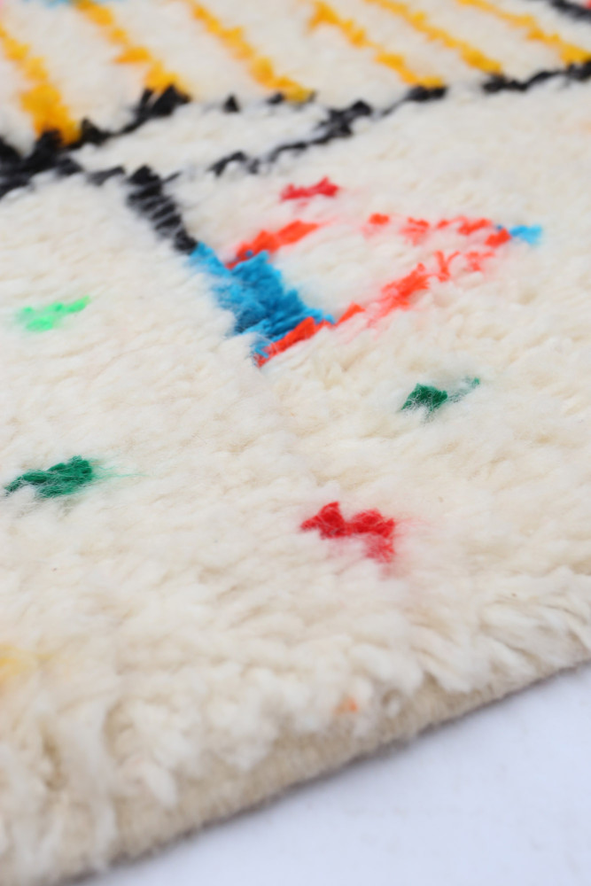 Ce tapis berbère que l'on appelle Azilal tient son nom de la région d'Azilal au Maroc où il a été confectionné à la main sur un métier à tisser traditionnel en bois. Ses motifs représentent les humeurs, les amours, les peines de la tisseuse au moment de sa création. Une fois ce tapis berbère coloré créé, elle en confectionnera un autre totalement différent, en fonction de ses émotions du moment. Chaque pièce est donc unique.