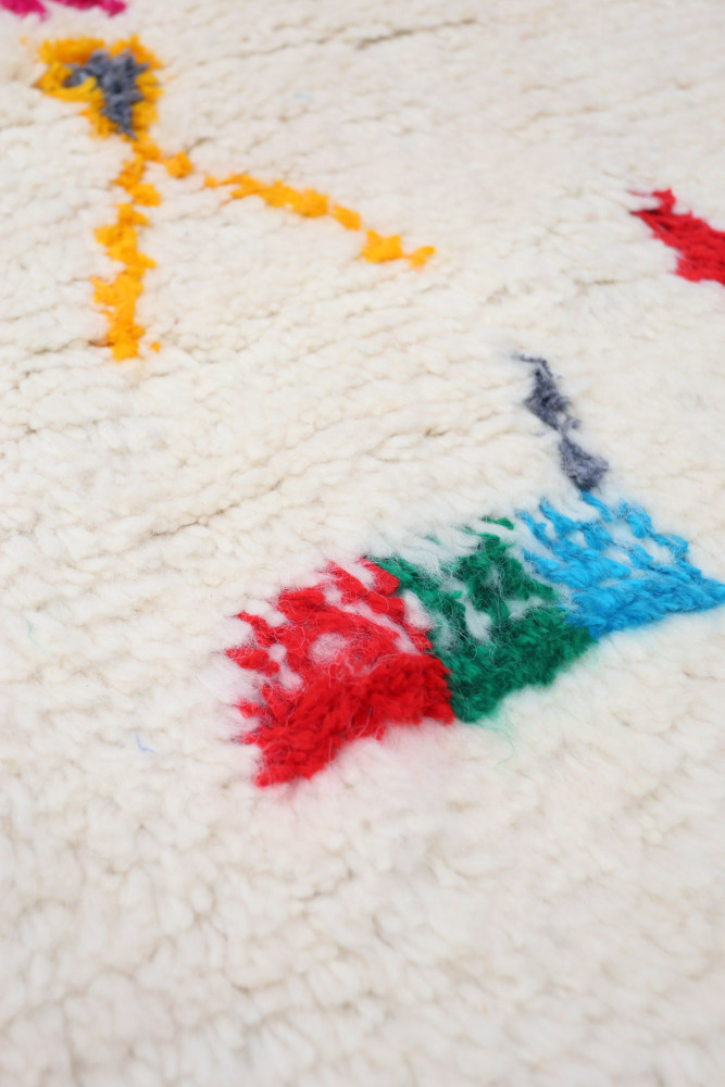 Ce tapis berbère que l'on appelle Azilal tient son nom de la région d'Azilal au Maroc où il a été confectionné à la main sur un métier à tisser traditionnel en bois. Ses motifs représentent les humeurs, les amours, les peines de la tisseuse au moment de sa création. Une fois ce tapis berbère coloré créé, elle en confectionnera un autre totalement différent, en fonction de ses émotions du moment. Chaque pièce est donc unique.