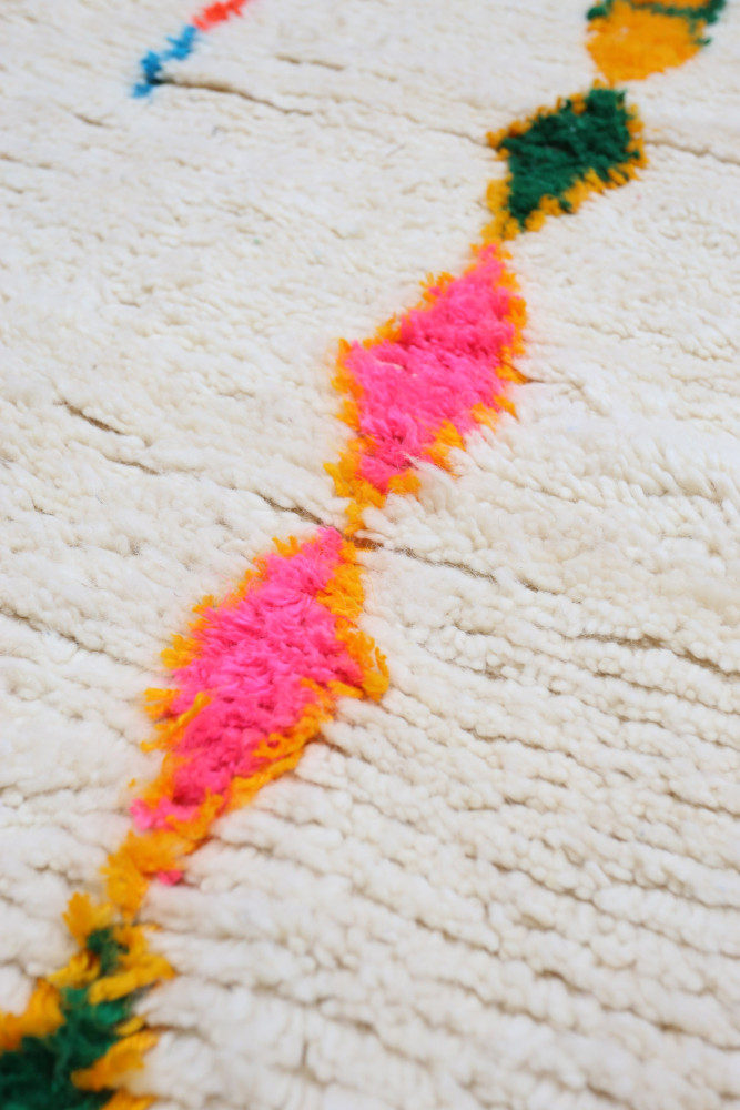 Ce tapis berbère que l'on appelle Azilal tient son nom de la région d'Azilal au Maroc où il a été confectionné à la main sur un métier à tisser traditionnel en bois. Ses motifs représentent les humeurs, les amours, les peines de la tisseuse au moment de sa création. Une fois ce tapis berbère coloré créé, elle en confectionnera un autre totalement différent, en fonction de ses émotions du moment. Chaque pièce est donc unique.