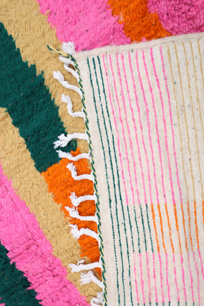 Ce tapis berbère que l'on appelle Azilal tient son nom de la région d'Azilal au Maroc où il a été confectionné à la main sur un métier à tisser traditionnel en bois. Ses motifs représentent les humeurs, les amours, les peines de la tisseuse au moment de sa création. Une fois ce tapis berbère coloré créé, elle en confectionnera un autre totalement différent, en fonction de ses émotions du moment. Chaque pièce est donc unique.