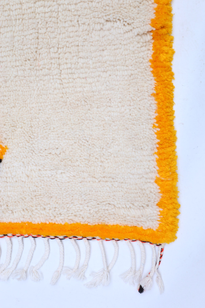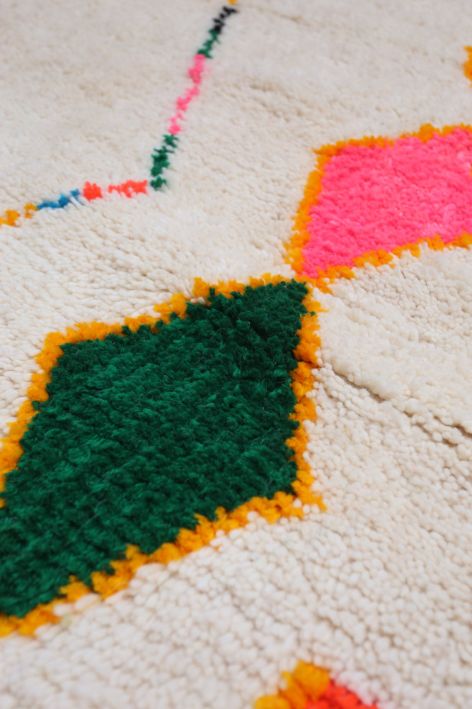 Ce tapis berbère que l'on appelle Azilal tient son nom de la région d'Azilal au Maroc où il a été confectionné à la main sur un métier à tisser traditionnel en bois. Ses motifs représentent les humeurs, les amours, les peines de la tisseuse au moment de sa création. Une fois ce tapis berbère coloré créé, elle en confectionnera un autre totalement différent, en fonction de ses émotions du moment. Chaque pièce est donc unique.