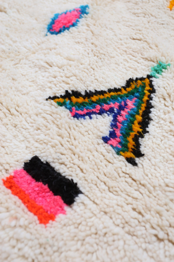 Nos tapis avec un fond blanc et des dessins colorés sont toujours avec un fond blanc en laine. Les couleurs peuvent être soit en coton soit en laine. Les couleurs très vives sont généralement en coton et les couleurs qui ont un rendu plus naturel sont elles en laine. Nos tapis qui sont tout colorés sont eux 100% en laine.