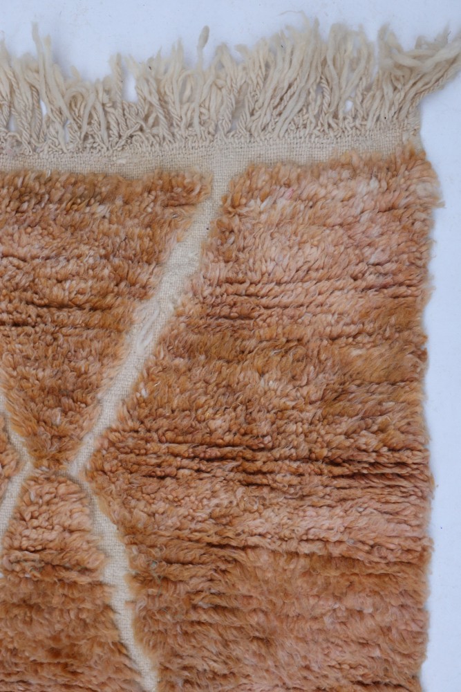 Ce tapis berbère que l'on appelle Azilal tient son nom de la région d'Azilal au Maroc où il a été confectionné à la main sur un métier à tisser traditionnel en bois. Ses motifs représentent les humeurs, les amours, les peines de la tisseuse au moment de sa création. Une fois ce tapis berbère coloré créé, elle en confectionnera un autre totalement différent, en fonction de ses émotions du moment. Chaque pièce est donc unique.