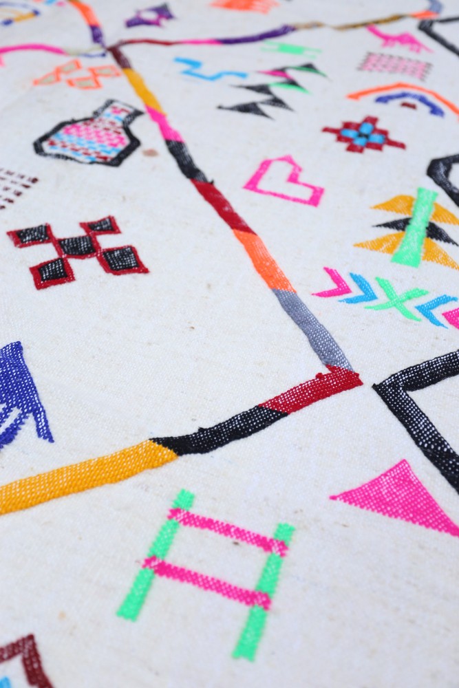 Ce tapis berbère que l'on appelle Azilal tient son nom de la région d'Azilal au Maroc où il a été confectionné à la main sur un métier à tisser traditionnel en bois. Ses motifs représentent les humeurs, les amours, les peines de la tisseuse au moment de sa création. Une fois ce tapis berbère coloré créé, elle en confectionnera un autre totalement différent, en fonction de ses émotions du moment. Chaque pièce est donc unique.