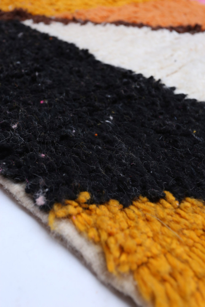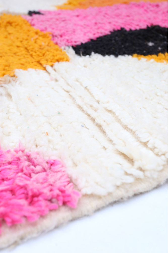 Ce tapis berbère que l'on appelle Azilal tient son nom de la région d'Azilal au Maroc où il a été confectionné à la main sur un métier à tisser traditionnel en bois. Ses motifs représentent les humeurs, les amours, les peines de la tisseuse au moment de sa création. Une fois ce tapis berbère coloré créé, elle en confectionnera un autre totalement différent, en fonction de ses émotions du moment. Chaque pièce est donc unique.