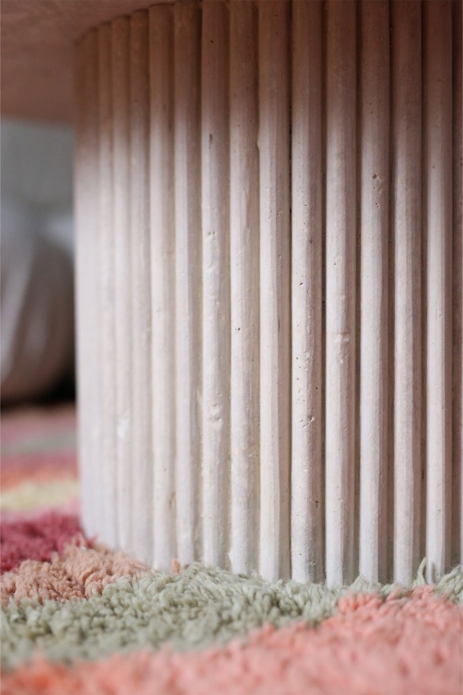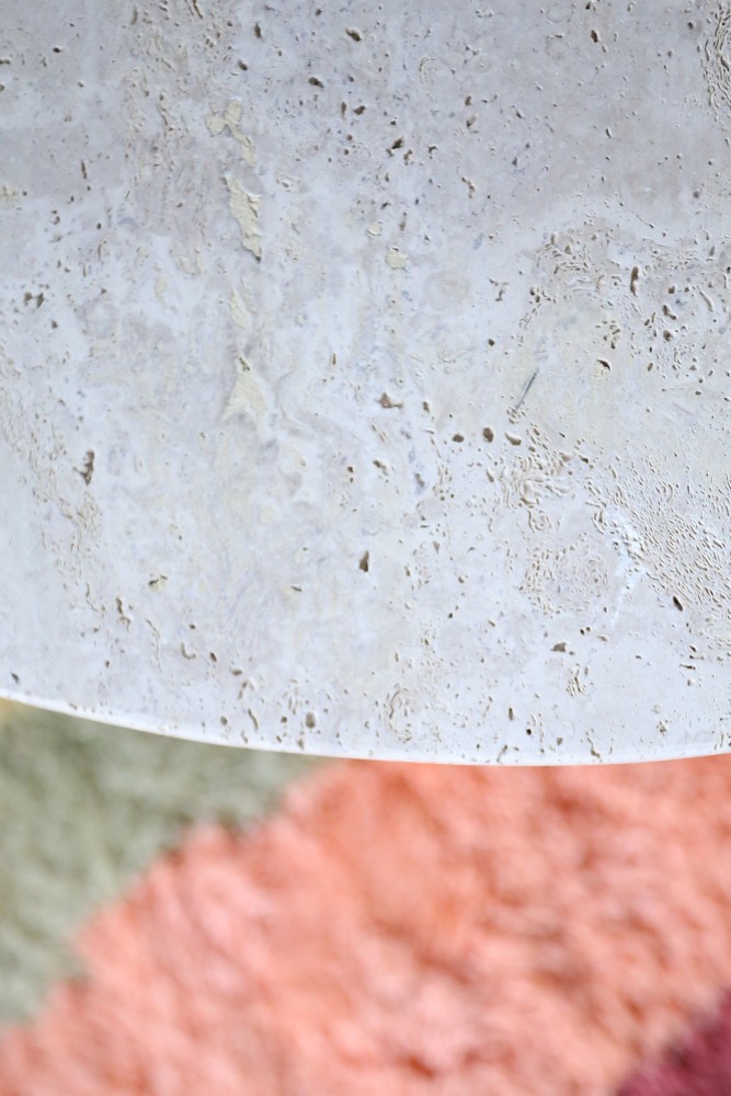 Tavolino in travertino beige realizzato artigianalmente in Marocco, con un piano di 80 cm e un piede rotondo a righe.