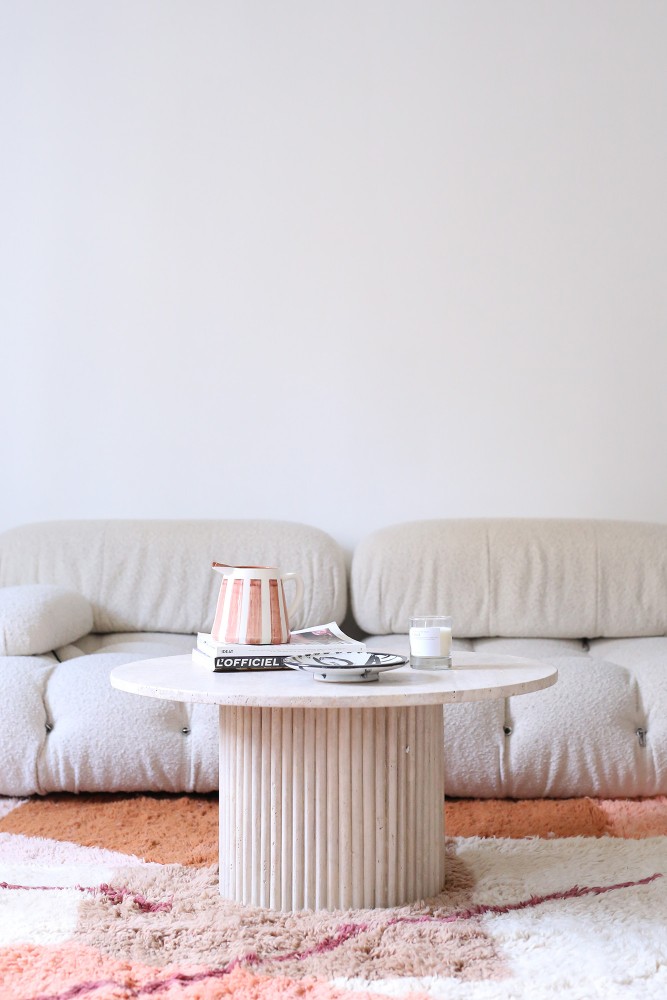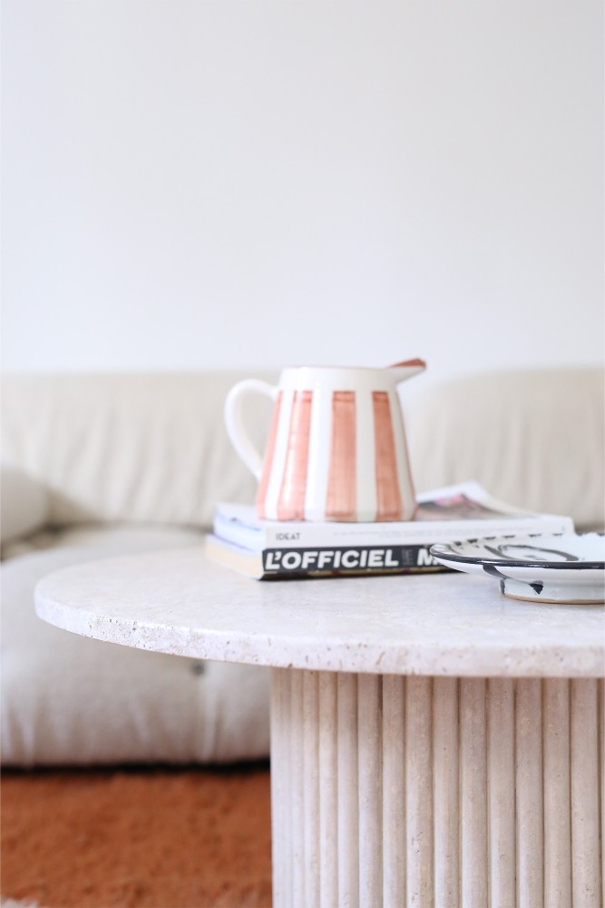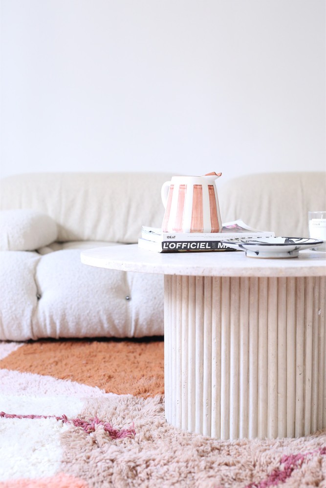 Tavolino da caffè in travertino progettato da Marion, la fondatrice di Them, e realizzato artigianalmente al 100% in Marocco presso uno dei nostri talentuosi laboratori partner.