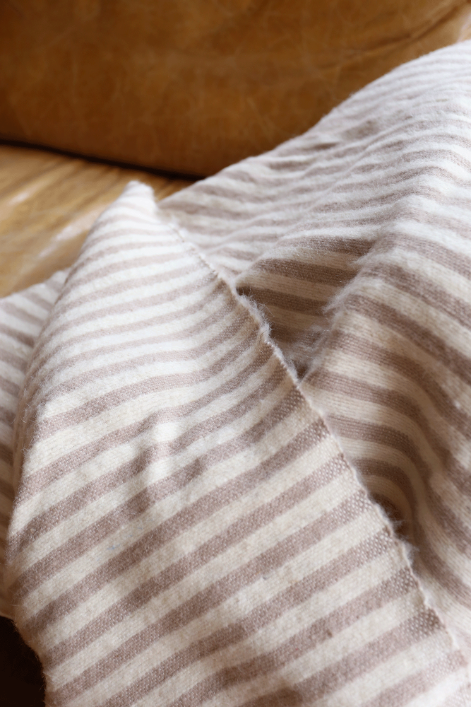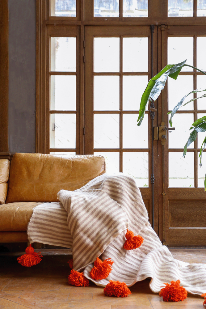Plaid berbero con pon pon a righe color tortora. -