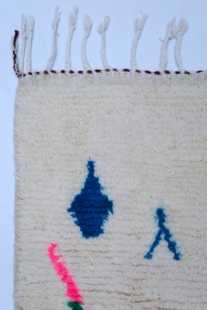Questo tappeto berbero chiamato Azilal prende il nome dalla regione di Azilal in Marocco dove è stato realizzato a mano su un telaio tradizionale in legno. I suoi motivi rappresentano gli umori, gli amori, le tristezze della tessitrice al momento della sua creazione. Una volta creato questo tappeto berbero colorato, ne creerà un altro completamente diverso, in base alle sue emozioni del momento. Ogni pezzo è quindi unico.