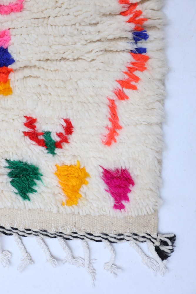 Questo tappeto berbero chiamato Azilal prende il nome dalla regione di Azilal in Marocco, dove è stato realizzato a mano su un telaio tradizionale in legno. I suoi motivi rappresentano gli stati d'animo, gli amori, i dolori della tessitrice al momento della sua creazione. Una volta che questo tappeto berbero colorato è stato creato, ne creerà un altro completamente diverso, in base alle sue emozioni del momento. Ogni pezzo è quindi unico.