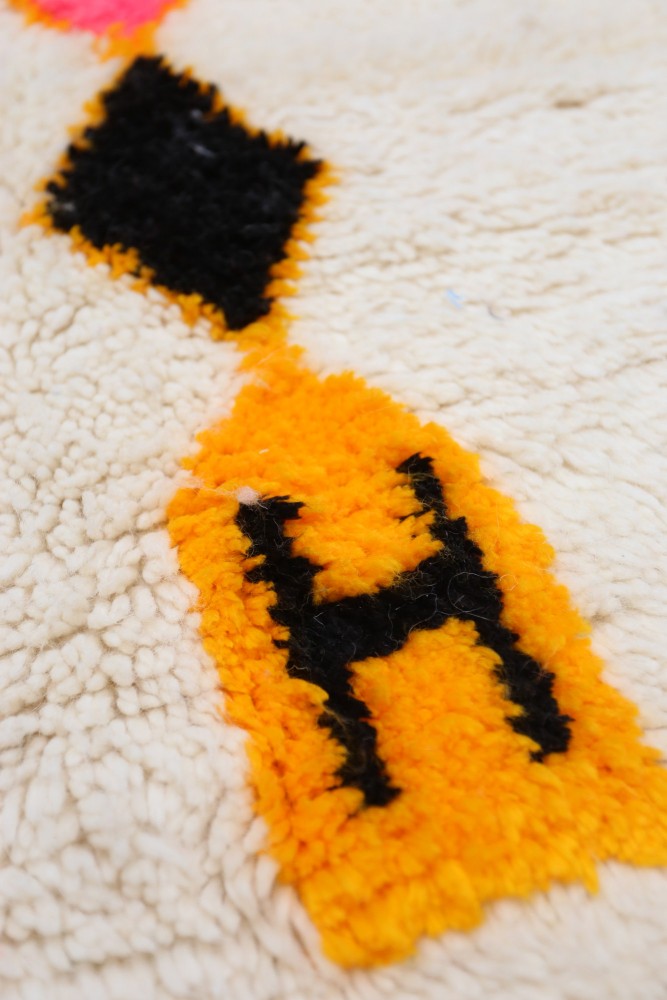 Questo tappeto berbero chiamato Azilal prende il nome dalla regione di Azilal in Marocco, dove è stato realizzato a mano su un telaio tradizionale in legno. I suoi motivi rappresentano gli stati d'animo, gli amori, i dolori della tessitrice al momento della sua creazione. Una volta che questo tappeto berbero colorato è stato creato, ne creerà un altro completamente diverso, in base alle sue emozioni del momento. Ogni pezzo è quindi unico.