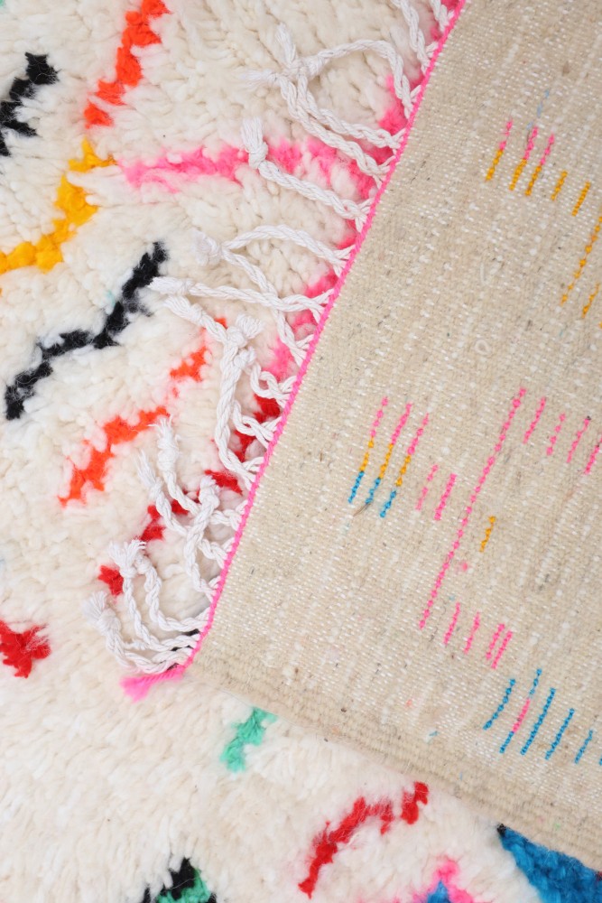 Questo tappeto berbero chiamato Azilal prende il nome dalla regione di Azilal in Marocco, dove è stato realizzato a mano su un telaio tradizionale in legno. I suoi motivi rappresentano gli stati d'animo, gli amori, i dolori della tessitrice al momento della sua creazione. Una volta che questo tappeto berbero colorato è stato creato, ne creerà un altro completamente diverso, in base alle sue emozioni del momento. Ogni pezzo è quindi unico.