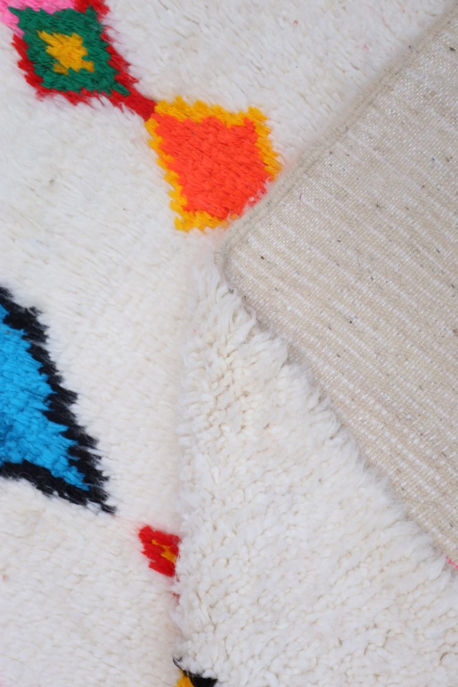 Questo tappeto berbero chiamato Azilal prende il nome dalla regione di Azilal in Marocco, dove è stato realizzato a mano su un telaio tradizionale in legno. I suoi motivi rappresentano gli stati d'animo, gli amori, i dolori della tessitrice al momento della sua creazione. Una volta che questo tappeto berbero colorato è stato creato, ne creerà un altro completamente diverso, in base alle sue emozioni del momento. Ogni pezzo è quindi unico.