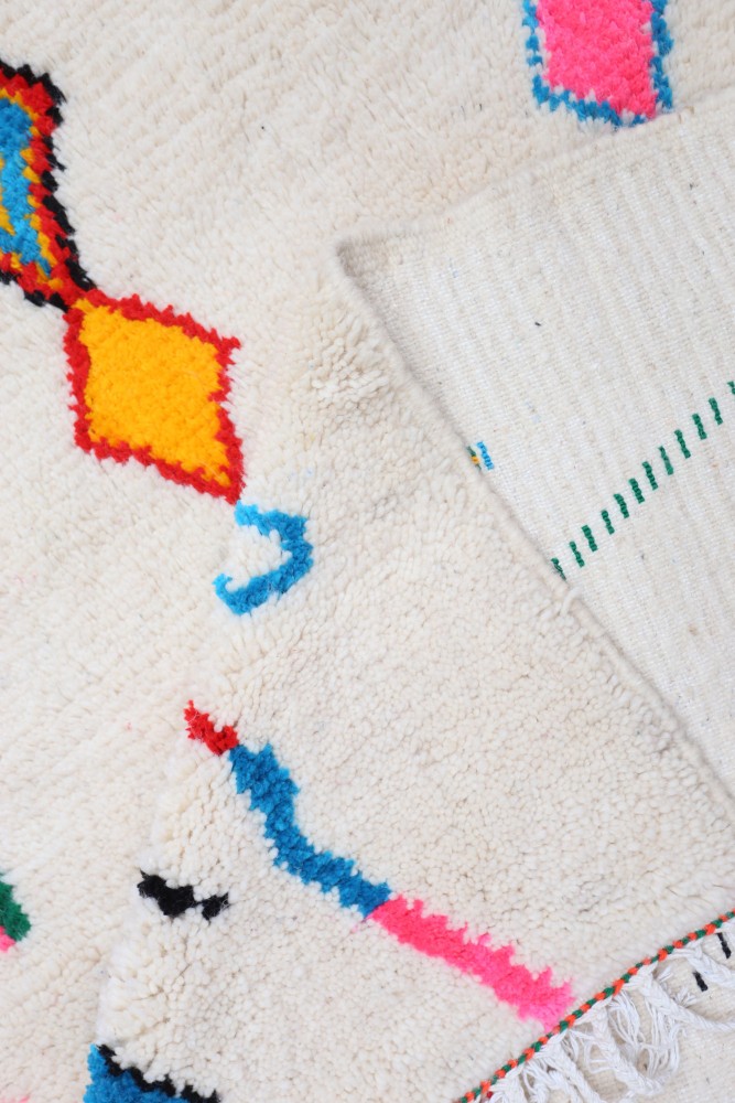 Questo tappeto berbero chiamato Azilal prende il nome dalla regione di Azilal in Marocco, dove è stato realizzato a mano su un telaio tradizionale in legno. I suoi motivi rappresentano gli stati d'animo, gli amori, i dolori della tessitrice al momento della sua creazione. Una volta che questo tappeto berbero colorato è stato creato, ne creerà un altro completamente diverso, in base alle sue emozioni del momento. Ogni pezzo è quindi unico.